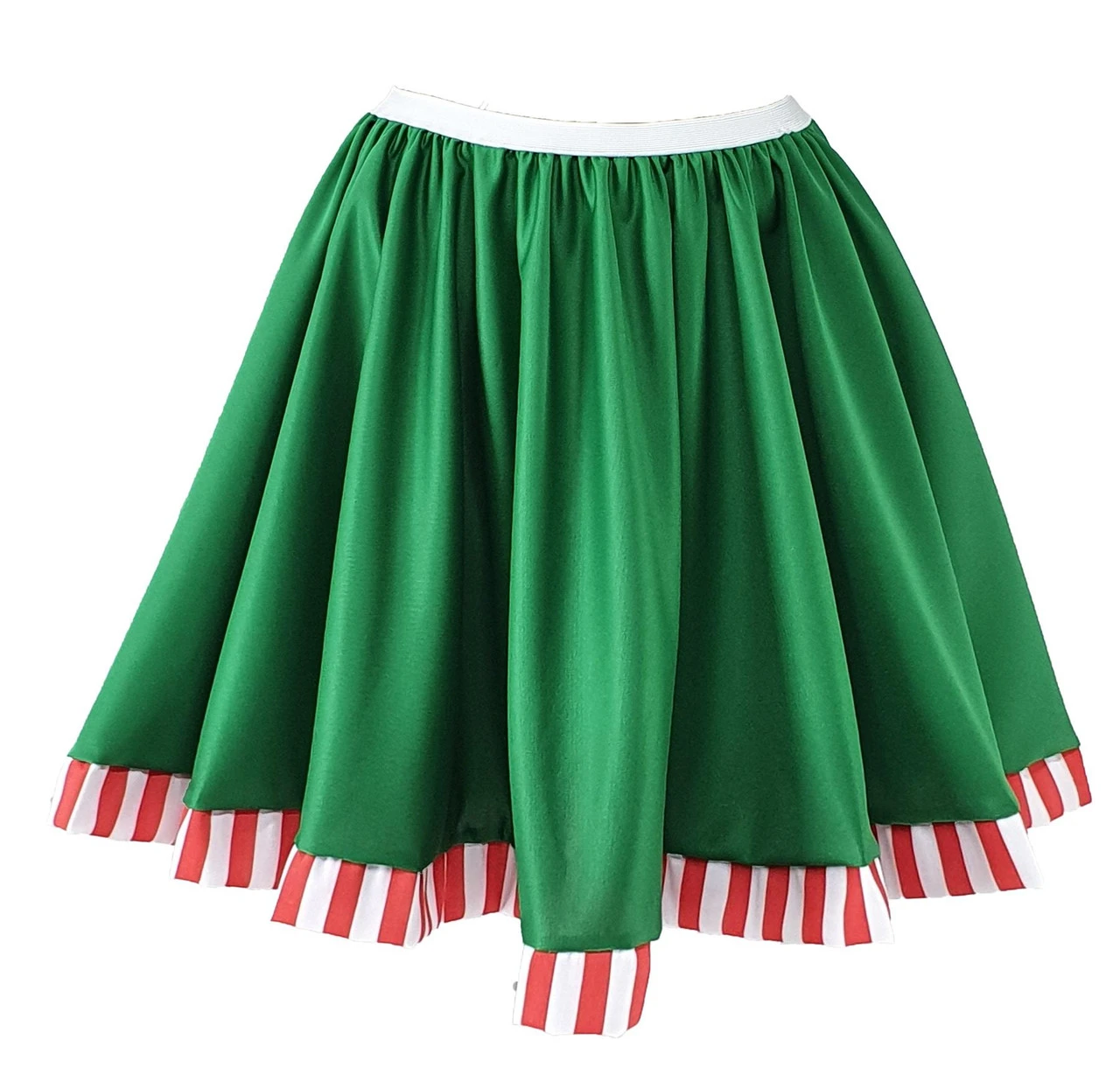 Childs Festive Christmas Santa’s Little Helper Elf Green Skater Skirt, With Candy Cane Trim, 15″ Length With Elastic Waistband to Fit a Range of Sizes