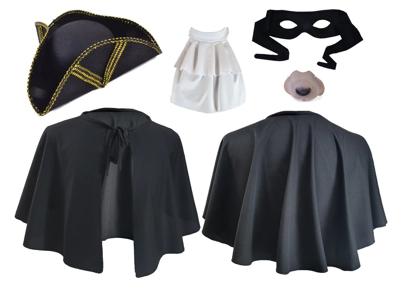 Includes: Tri Cone Hat, Mantle Cape, Cravat, Rat Nose & Bandit Mask