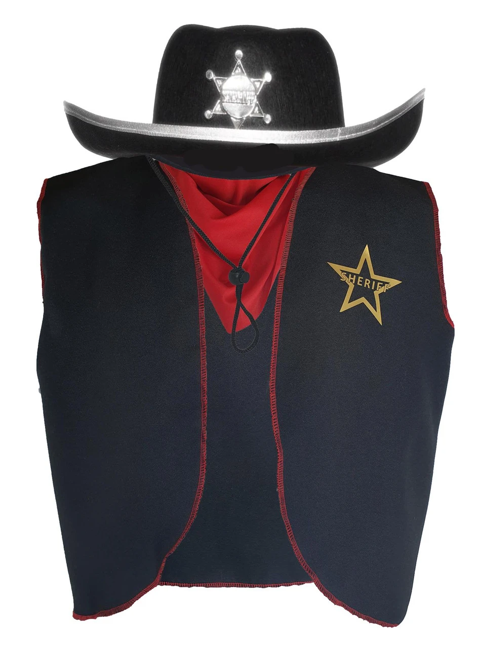 Includes: Waistcoat With Printed Sheriff Badge, Wild Rag (Neckerchief) & Black Sheriff Hat