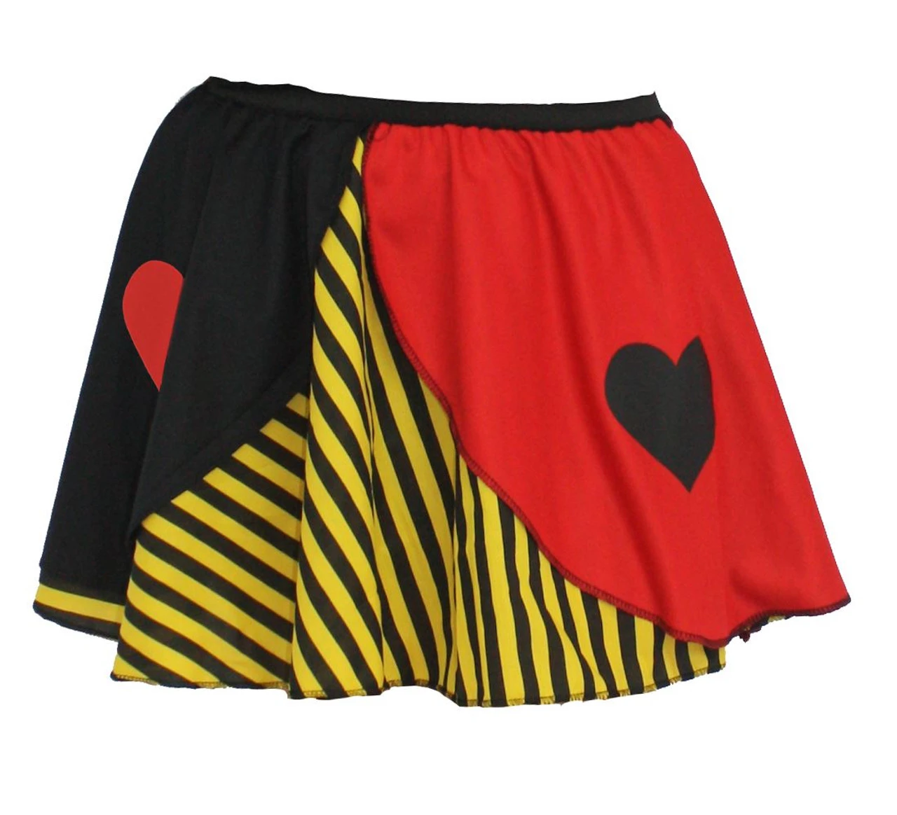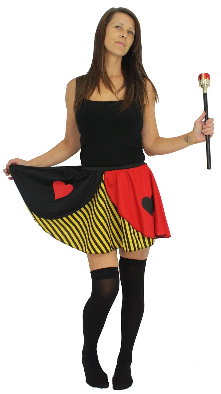 Ladies Queen of Hearts Skater Skirt is the Perfect Addition to any Queen of hearts costume, The Red, Black & Yellow Skirt Features a Black 1″ Elasticated Waistband for a Comfortable Fit & Contrasting Loveheart Printed Either Side of the Skirt with White & Black Striped Centre Piece!