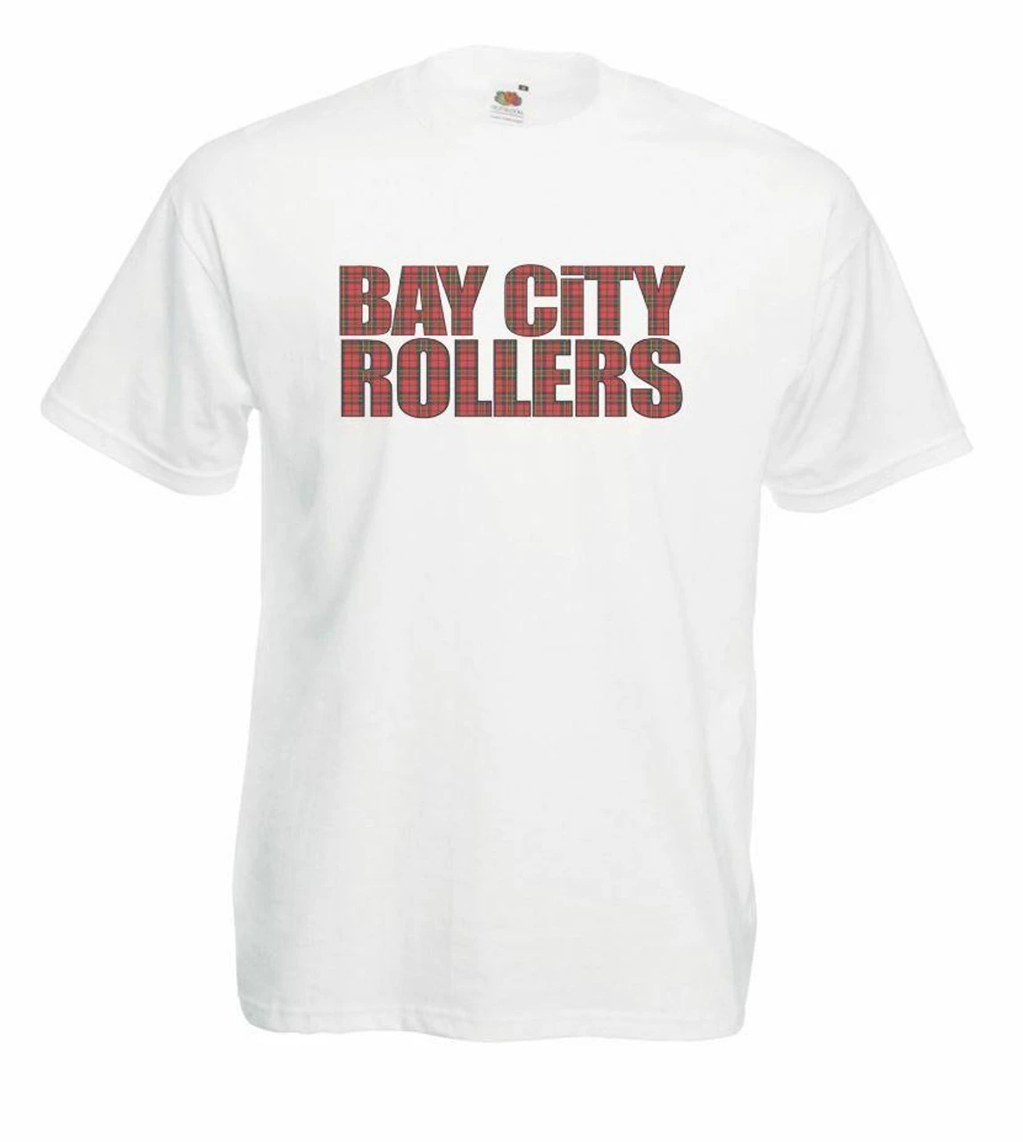 Mens White Bay City Rollers is made from 100% Cotton, Fruit of the Loom branded, high quality and UK made & printed.