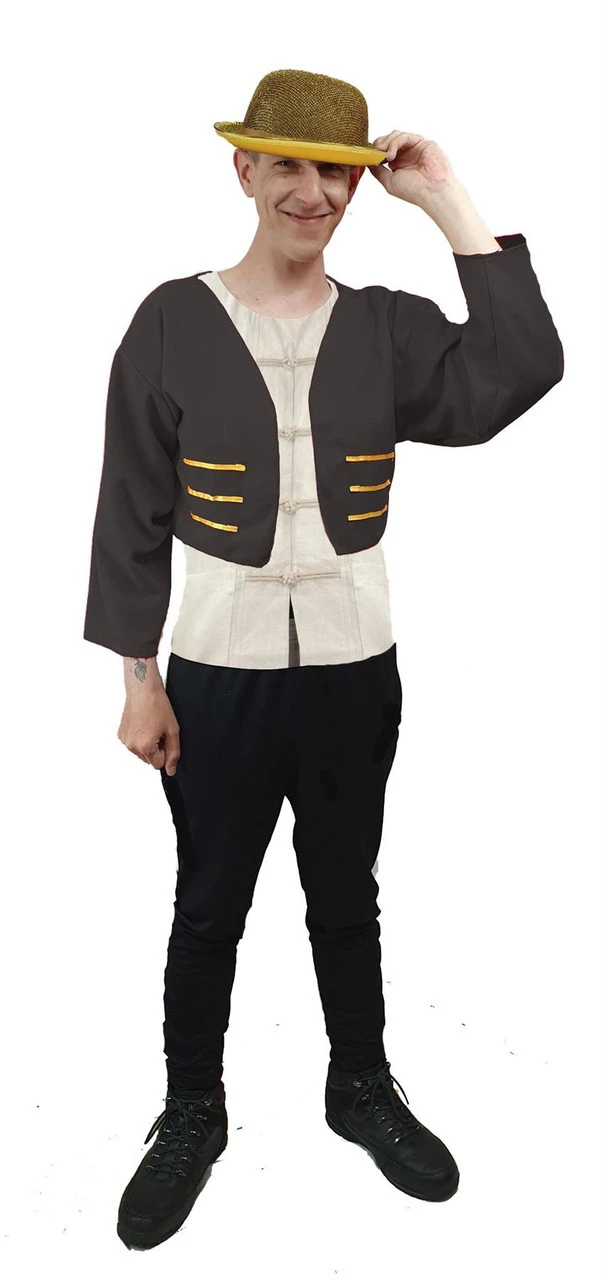 Organ Grinder Costume Includes: Black Jacket With Gold Trim & Gold Bowler Hat